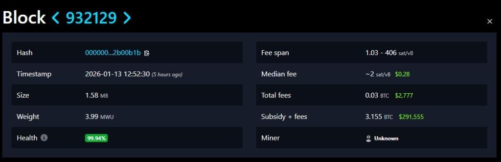 Block 932129, mined January 13, 2026, delivered 3.155 BTC (subsidy plus fees) worth approximately $291,555 to an unknown solo miner.